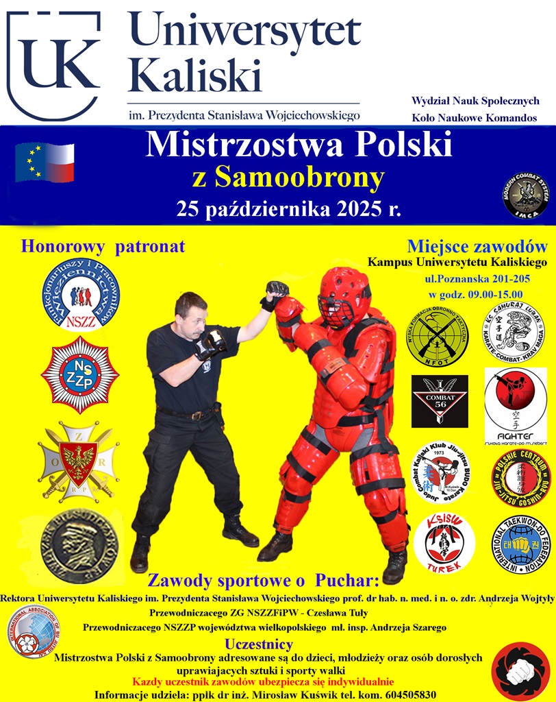 Dodatkowym punktem programu będą Mistrzostwa Polski z Samoobrony, które rozegrane zostaną 25 października na kampusie Uniwersytetu Kaliskiego. Zawody sportowe adresowane są do dzieci, młodzieży oraz dorosłych uprawiających sztuki i sporty walki.
